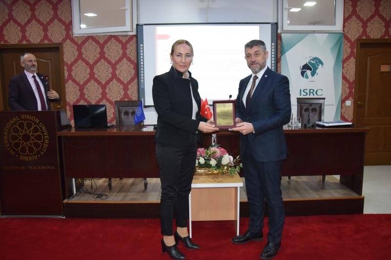 Konferansın sonunda Rektör Prof. Dr. Ahmet Vecdi Can tarafından Prof. Dr. Fatma Gül Cirhinlioğluna plaket takdim edildi.