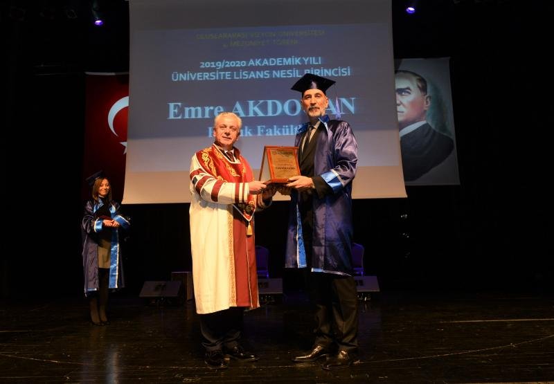 The Rector of International VİZYON University Prof. Dr. Fadil HOCA himself presented his plaque to EMRE AKDOGAN as being the first in generation in the Academic Year 2019/2020.